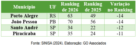 Porto Alegre (RS) apresentou uma das maiores quedas no Ranking de 2026, com recuo de 14 posições, resultado principalmente da redução no atendimento de esgoto e do aumento nos indicadores de perdas. João Pessoa (PB) também caiu 14 posições, com retração nos indicadores de atendimento de água e esgoto, além do aumento das perdas de água.
