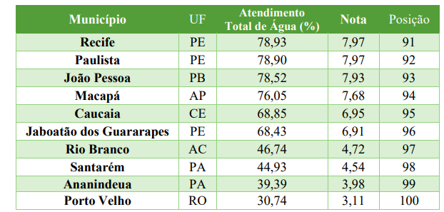Por outro lado, o menor percentual de atendimento de água em 2024 foi de 30,74%, registrado em Porto Velho (RO). No ano anterior, 2023, o menor índice também foi observado no município, com 35,02%.