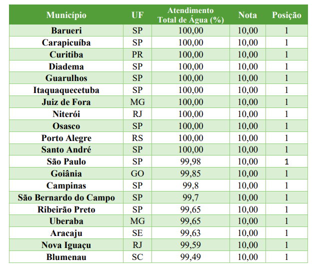Ao todo, 28 municípios já atingiram a universalização do abastecimento de água, conforme as metas do Marco Legal do Saneamento. Desse grupo, 11 registram cobertura total de 100%: Barueri (SP), Carapicuíba (SP), Curitiba (PR), Diadema (SP), Guarulhos (SP), Itaquaquecetuba (SP), Juiz de Fora (MG), Niterói (RJ), Osasco (SP), Porto Alegre (RS) e Santo André (SP). Além disso, outros 17 municípios apresentam índices iguais ou superiores a 99% de atendimento.