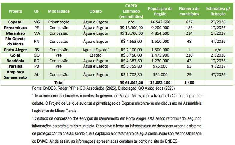 De acordo com um estudo do Instituto Trata Brasil, que avalia o estágio de implementação do Marco Legal do Saneamento Básico, nove projetos estão em fase avançada de estruturação, com expectativa de conclusão em 2026.