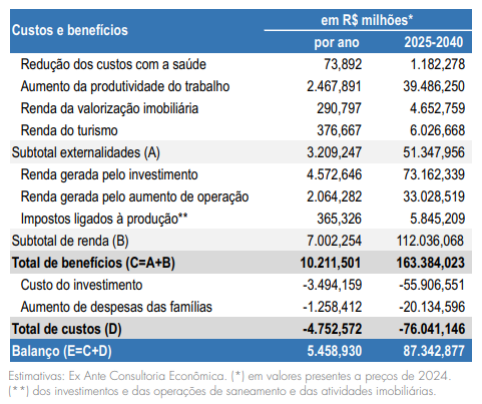 No período de 2025 a 2040, os benefícios da universalização devem alcançar R$ 163,384 bilhões, sendo R$ 112,036 bilhões de benefícios diretos (renda gerada pelo investimento e pelas atividades de saneamento e impostos sobre consumo e produção recolhidos) e cerca de R$ 51,348 bilhões devido à redução de perdas associadas às externalidades. Os custos sociais no período devem somar R$ 76,041 bilhões aproximadamente. Assim, os benefícios devem exceder os custos em R$ 87,343 bilhões, indicando um balanço social positivo para o estado.