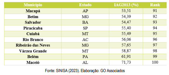 Observa-se ainda que, dos 100 municípios avaliados, apenas 21 possuem índices inferiores a 25%, enquanto 14 apresentam valores superiores a 50%. Essa heterogeneidade no desempenho operacional dos sistemas indica um amplo e urgente potencial de redução de água perdida em parte significativa do território nacional.